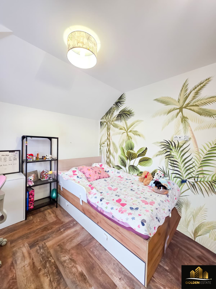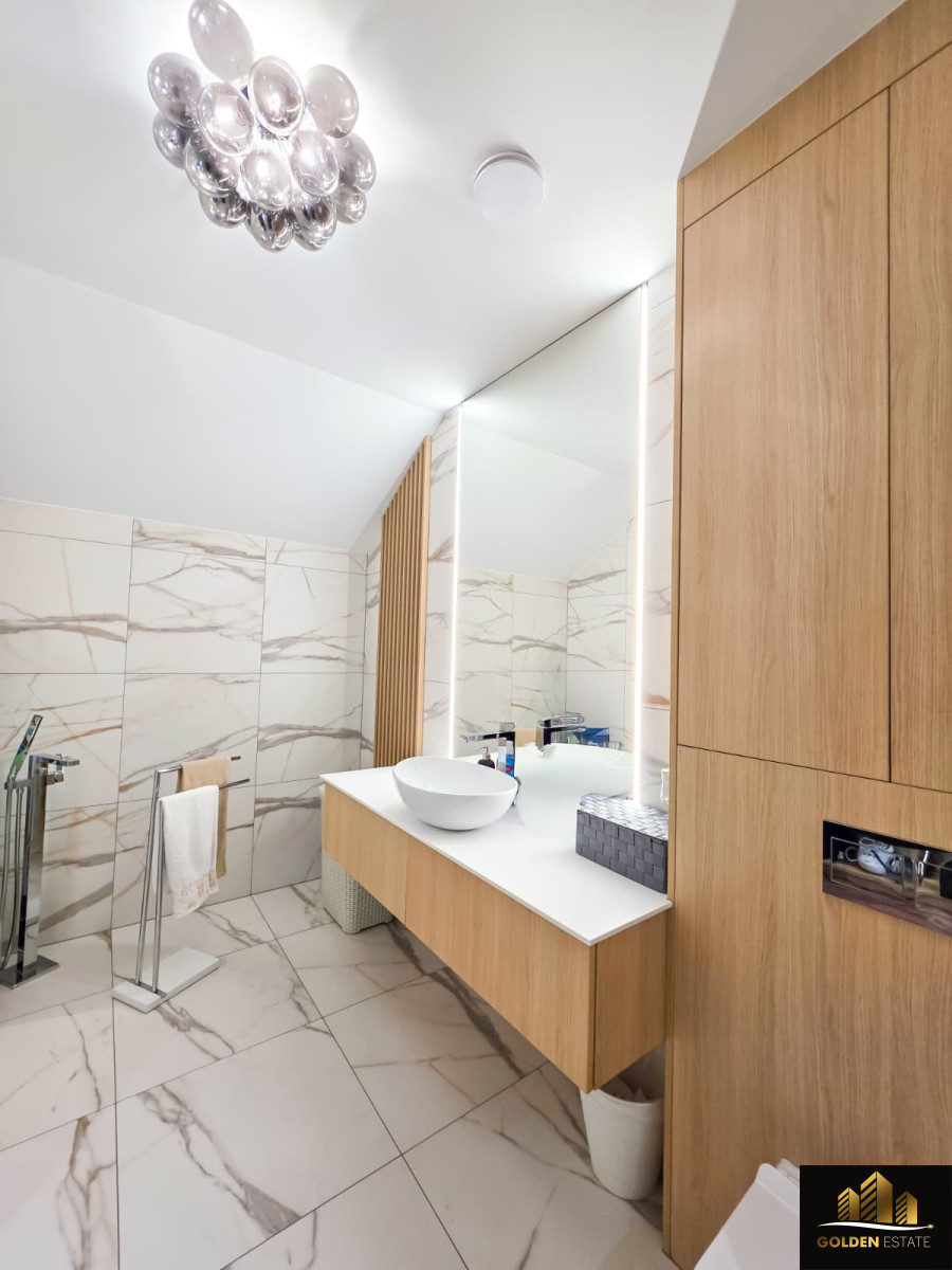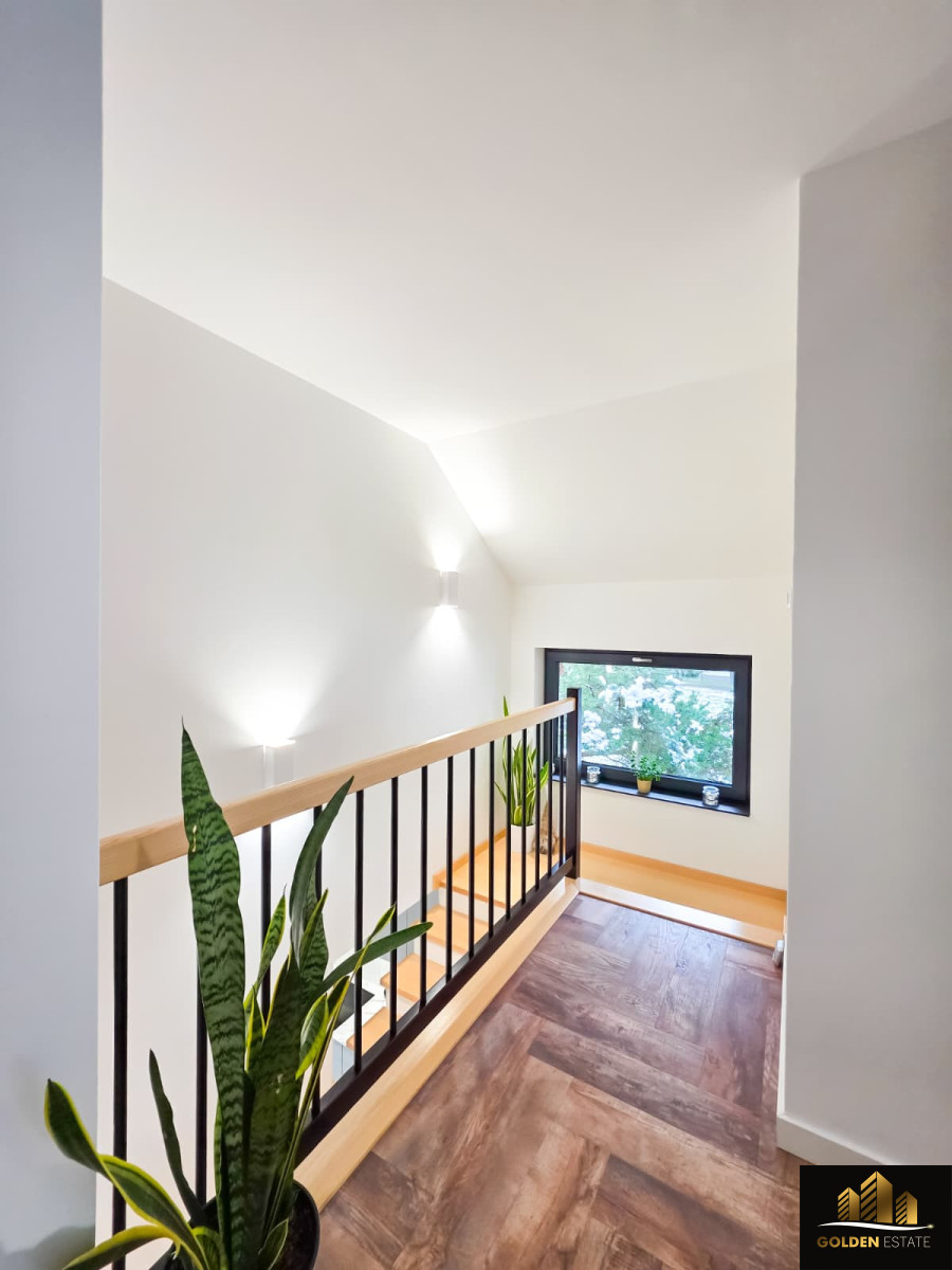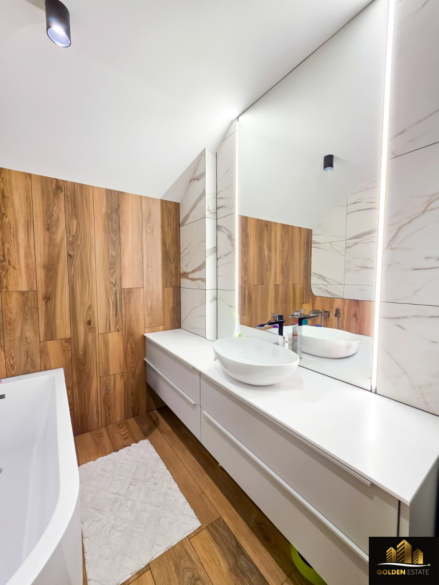 - Piętro: duża sypialnia master bedroom z prywatną łazienką oraz garderobą, dwa dodatkowe pokoje, druga łazienka obsługująca te pokoje.