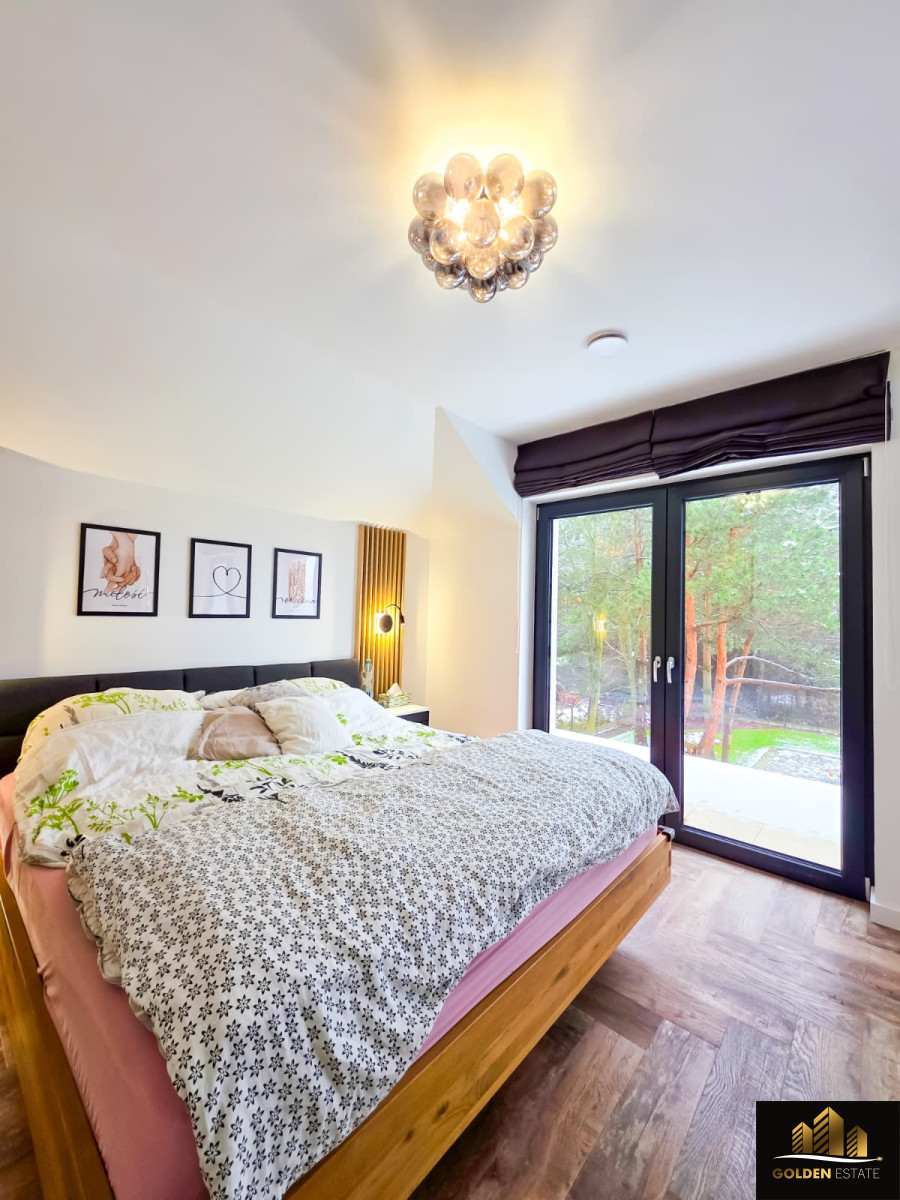 - Parter: przestronny, półotwarty salon z kuchnią, łazienka, bezpośrednie przejście do garażu, wyjście na taras z widokiem na las.